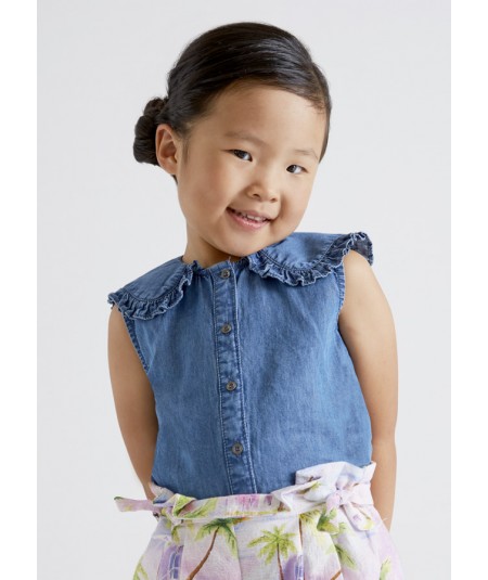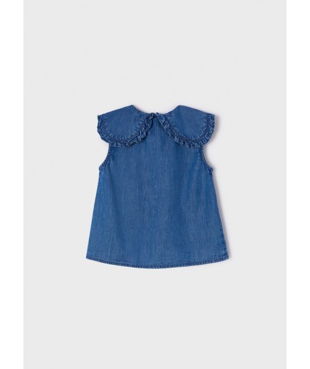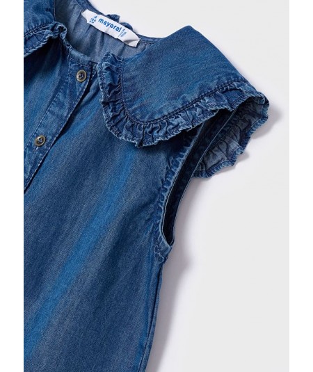 Blusón vaquero sin mangas para niña, con bonito cuello. De Mayoral.