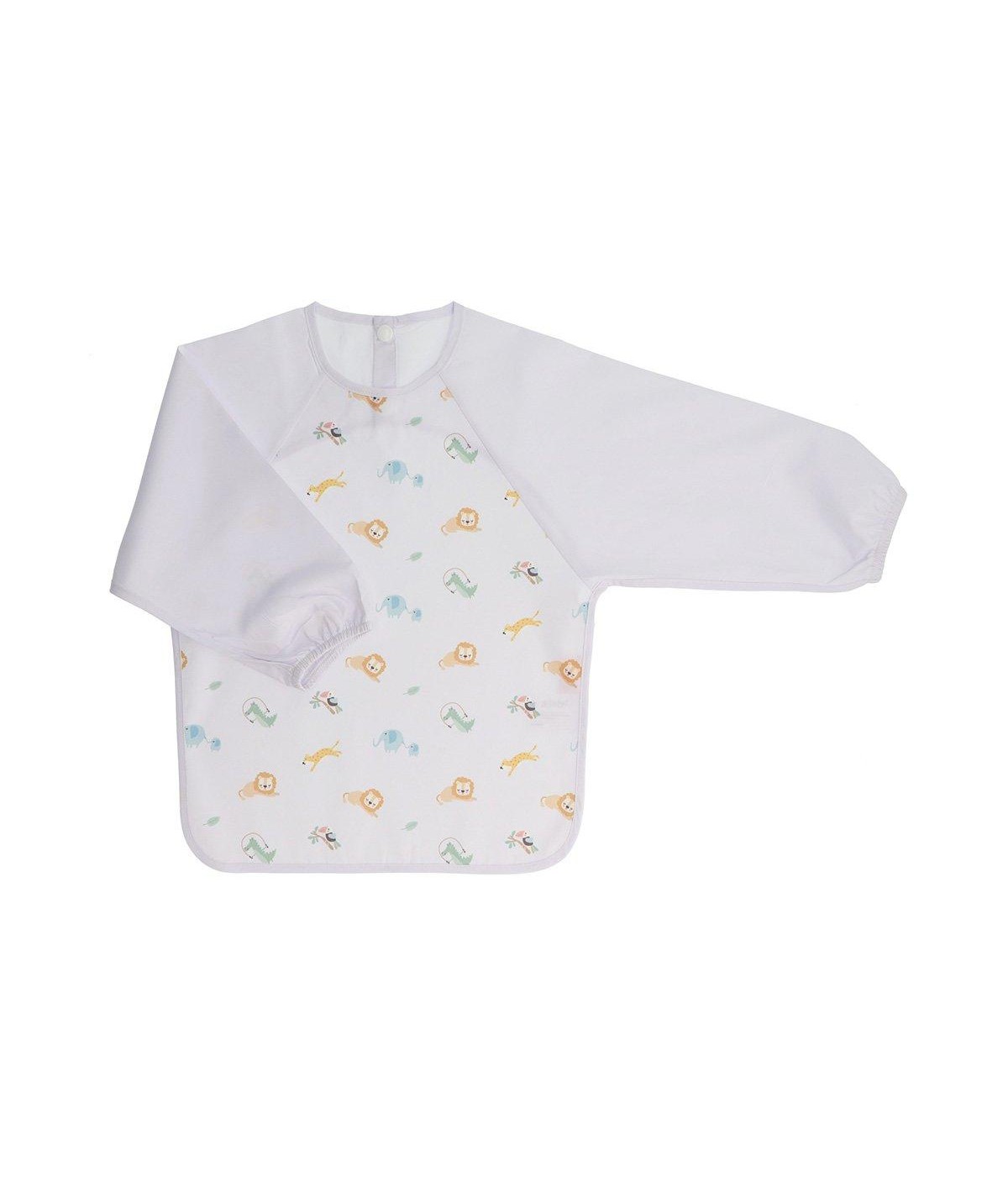 Babero con mangas fabricado en poliéster con acabado waterproff, una capa repelente al agua y los líquidos, lo que lo hace ideal para proteger la ropa de los peques durante las comidas y facilitando su limpieza posterior.