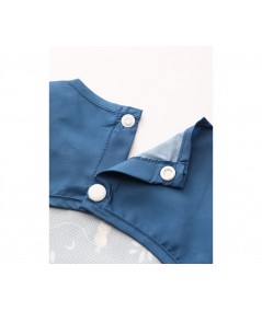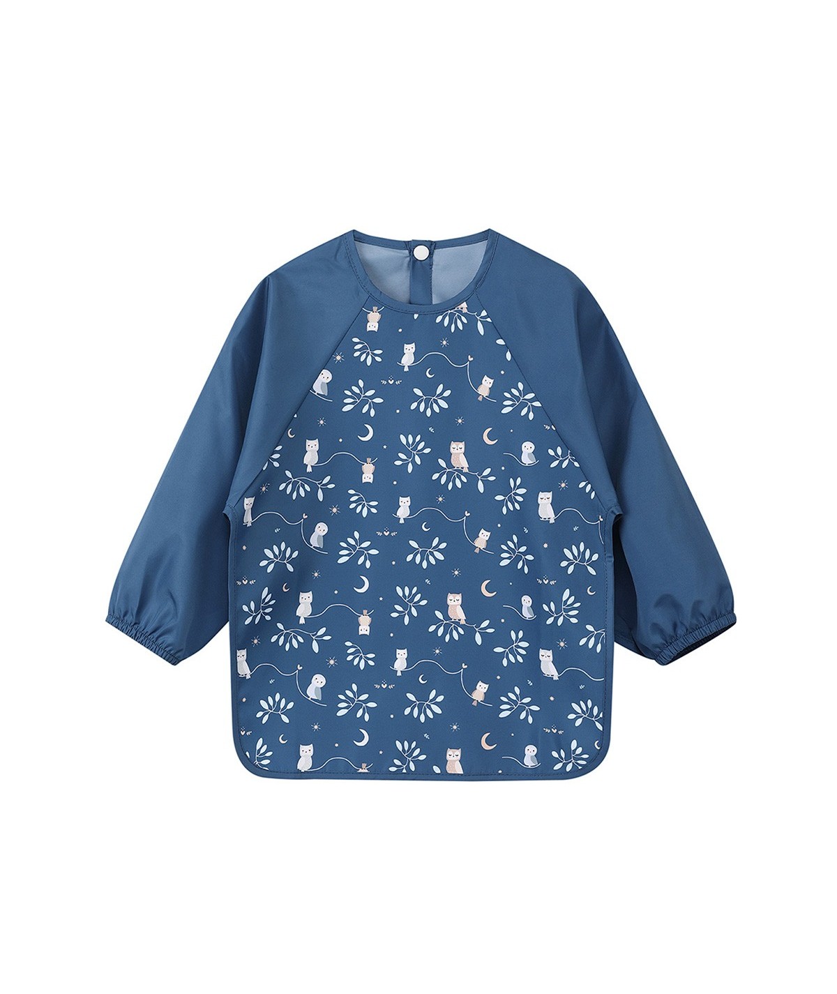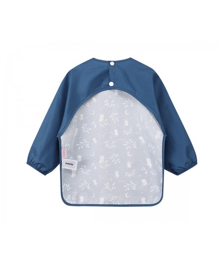 Babero con mangas fabricado en poliéster con acabado waterproff, una capa repelente al agua y los líquidos, lo que lo hace ideal para proteger la ropa de los peques durante las comidas y facilitando su limpieza posterior.