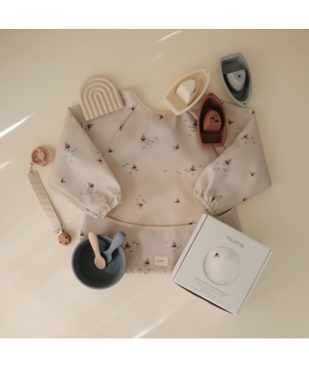 Babero con mangas y bolsillo delantero, muy prácticos, fáciles de limpiar. De Mushie.