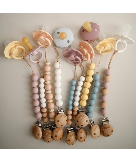 Cadena porta-chupetes con cierre mediante clip de silicona, de colores únicos y elegantes, de inspiración vintage.