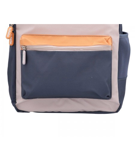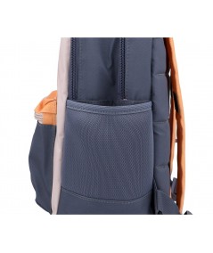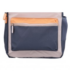 Exterior impermeable, cuenta con compartimento grande y un bolsillo delantero, ambos con cierre mediante cremallera, asas ajustables y cierre en el pecho mediante clip.