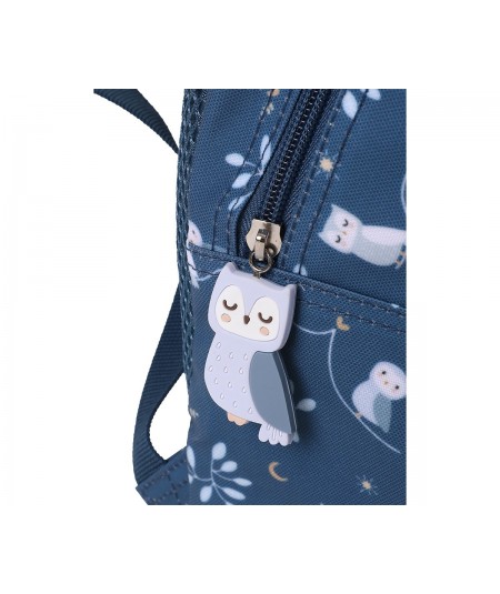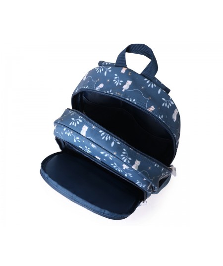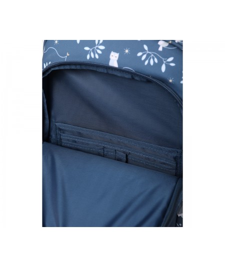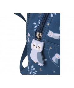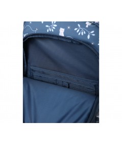 Un bolsillo frontal, que ocupa casi la altura de la mochila, con múltiples separadores interiores donde guardar lápices,cubiertos y pequeños artículos, que los peques tendrán más accesible