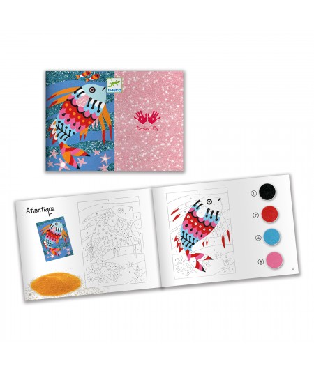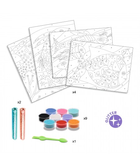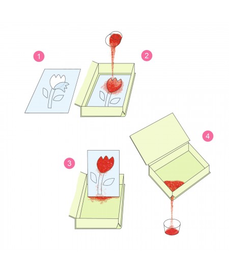 Contenido: 4 tarjetas ilustradas adhesivas (15 x 21 cm), 9 frascos de arena de colores, 2 tubos de purpurina, 1 herramienta de plástico y 1 folleto explicativo paso a paso a color.