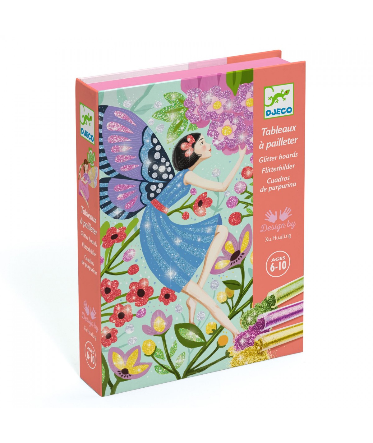 Coloca el cuadro en la caja, descubre las zonas adhesivas con la herramienta incluida y aplica los polvos de purpurina siguiendo el código de colores indicado en el folleto. De Djeco.