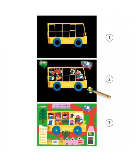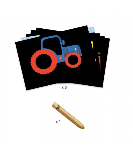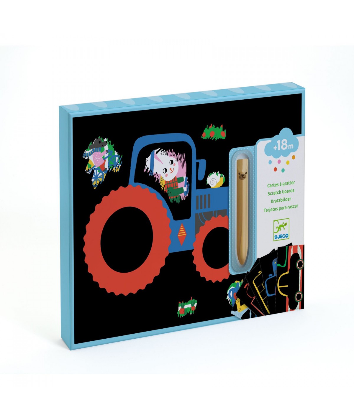 5 fantásticos cuadros para rascar sobre los vehículos con un gran punzón de madera apto para los más pequeños. De Djeco.