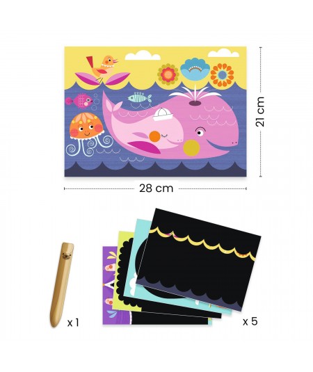 Contenido: 5 cuadros para rascar (21 x 28 cm), 1 punzón de madera con punta redondeada y 1 folleto con instrucciones paso a paso.