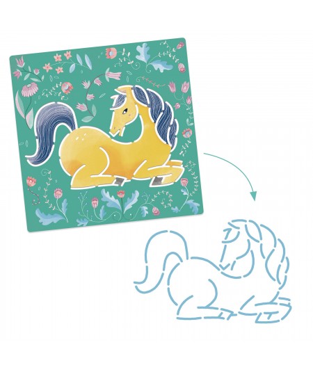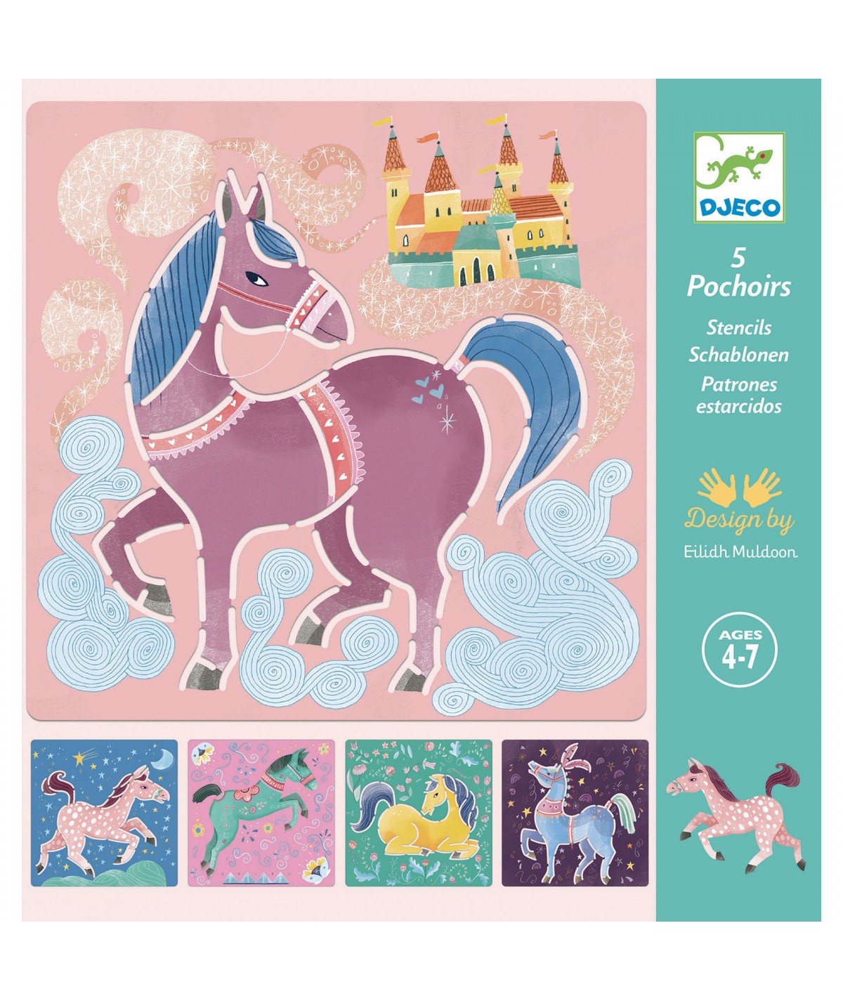 Set de 5 plantillas de plástico ilustradas para seguir el trazo del dibujo mediante las hendiduras. De Djeco.