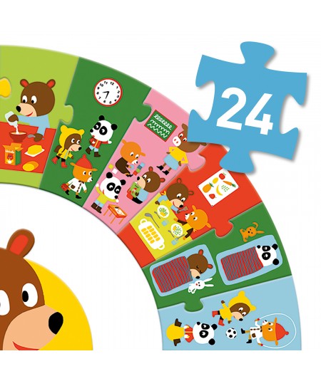 Puzzle gigante circular con 24 piezas donde nos indica los hábitos y acciones cotidianos desde que nos levantamos hasta que nos vamos a dormir. De Djeco.