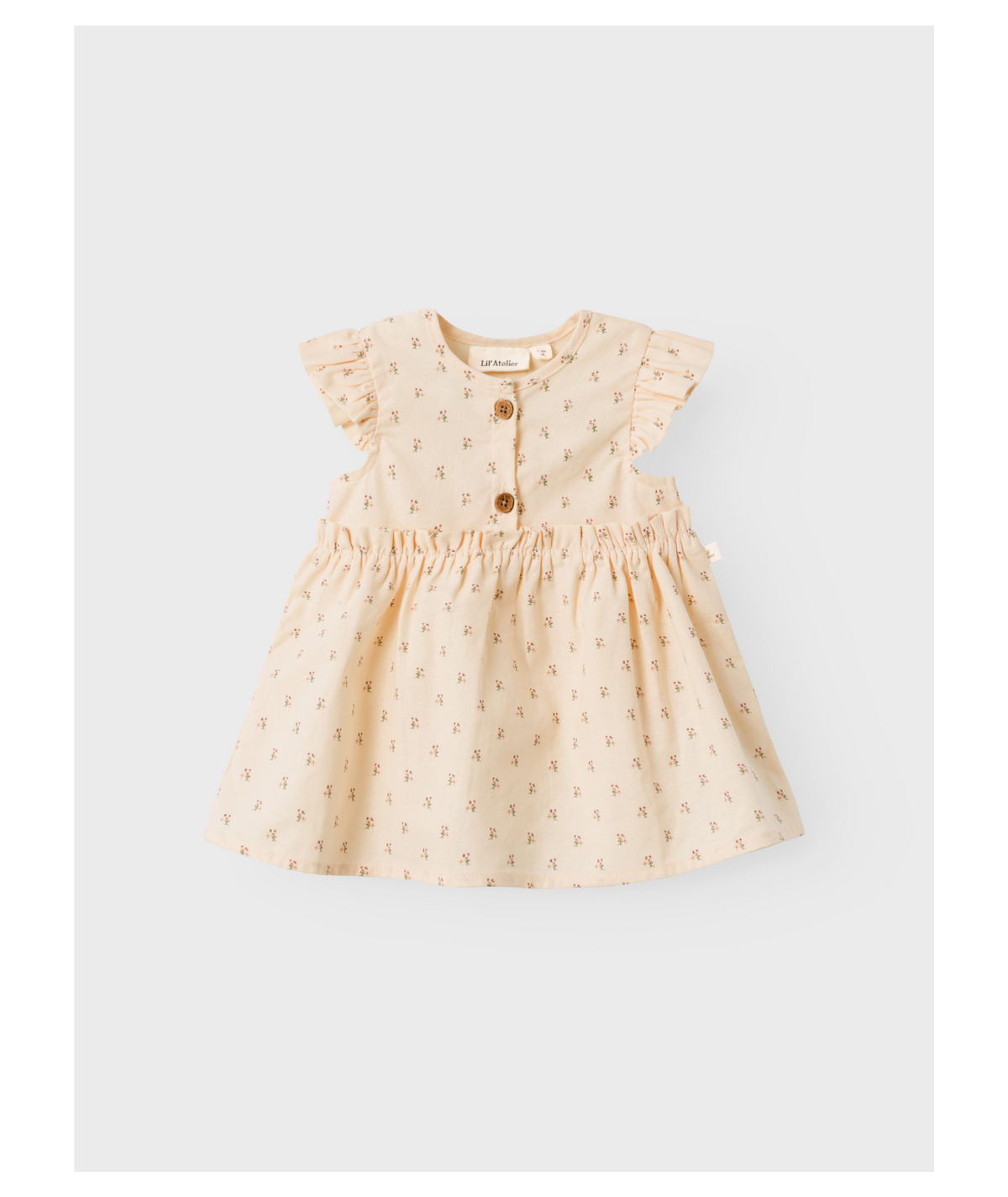 Vestido sin manga para bebé niña, con bonito y delicado estampado de flores, confeccionado en suave algodón orgánico. De Lil'Atelier.
