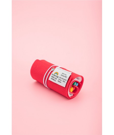 Entra guardado en un pequeño estuche enrollable, con 4 rotuladores y un paño para borrar.