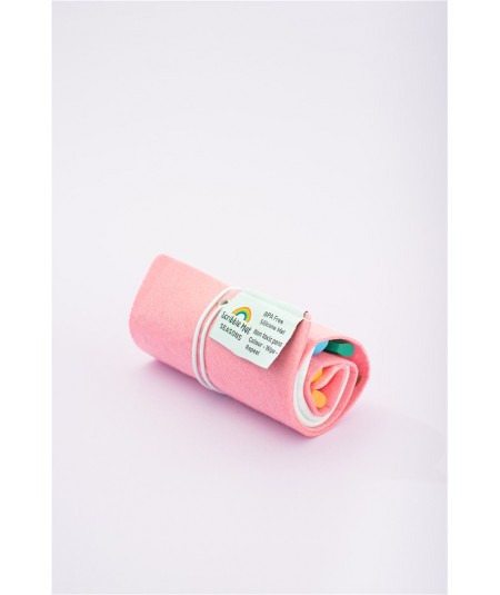 Entra guardado en un pequeño estuche enrollable, con 6 rotuladores y un paño para borrar.