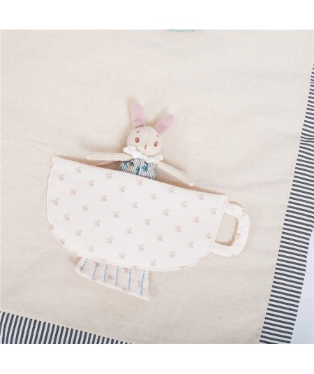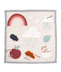 Suave y acolchada alfombra o manta de juego con actividades para bebé, perfecta para jugar y estimular sus sentidos. De Moulin Roty.