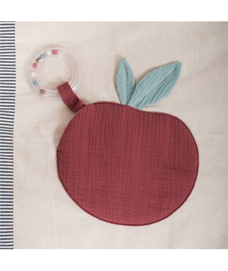 La manzana tiene un anillo transparente que suena cuando tu bebé juega con el. Y en la hoja se esconde un espejo para el autodescubrimiento.