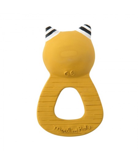 Mordedor de caucho natural, suave y flexible con diseño de un simpático gatito. De Moulin Roty.
