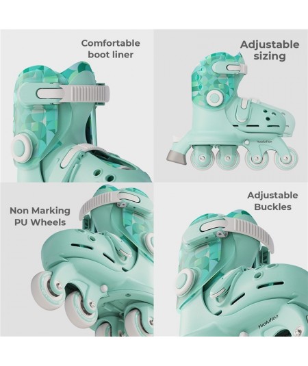 Lleva un mecanismo evolutivo para cambiar de 2 ruedas laterales a ruedas en línea sin herramientas.