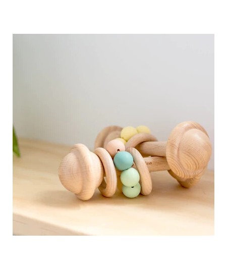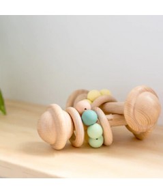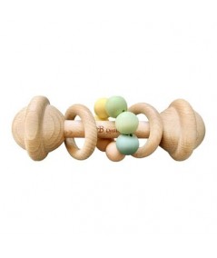 Bonito y práctico juguete de madera, tipo sonajero/mordedor, de diseño clásico y elegante consta de una base alargada sobre la que se deslizan dos anillas de madera y una de bolitas de silicona.