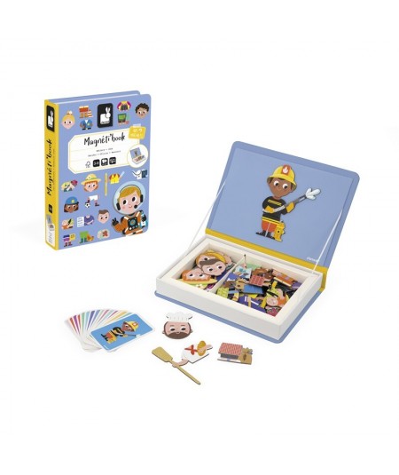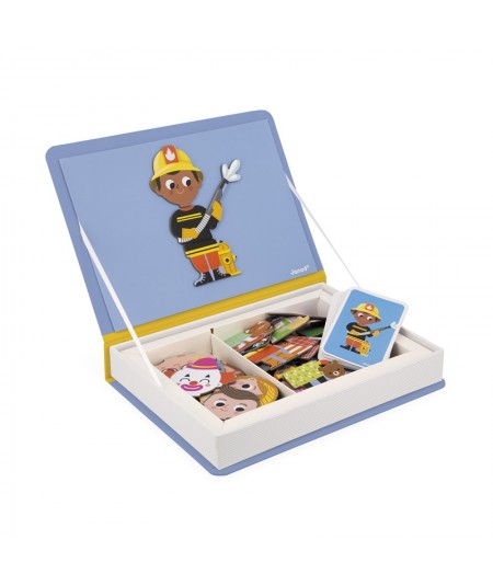 Estuche en forma de libro con una cara interior y 46 piezas magnéticas para crear diferentes y divertidos personajes. De Janod.
