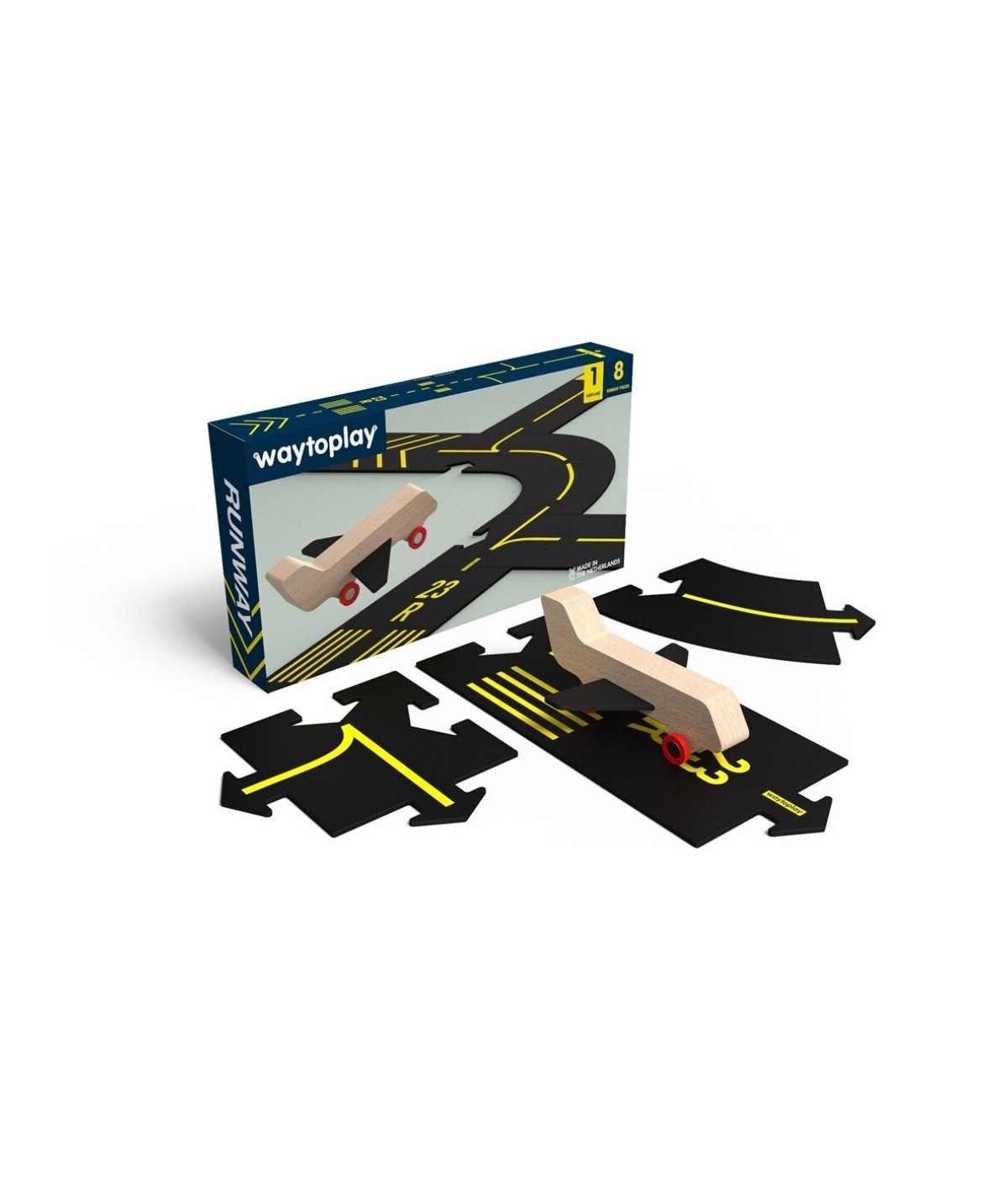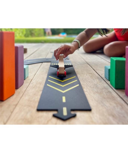 Pista de caucho flexible con avión de madera, con las que explorar e inventar un sin fin de posibilidades. Aptas para interiores y exteriores. De Waytoplay.