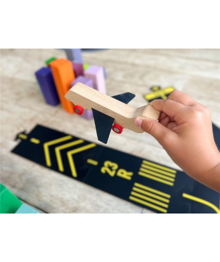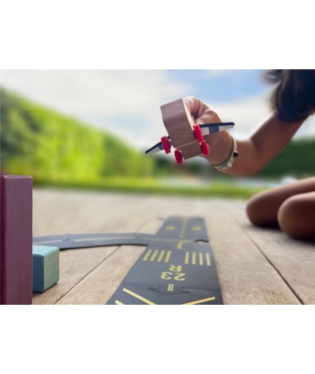 Pista de caucho flexible con avión de madera, con las que explorar e inventar un sin fin de posibilidades.