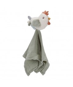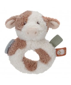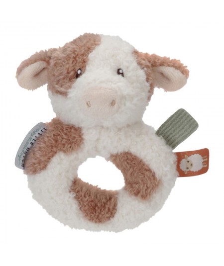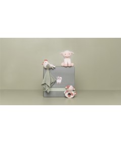 Un sonajero anillo en forma de vaca, un doudou con la gallina y un peluche de la ovejita, todo recogido en una preciosa caja de regalo.