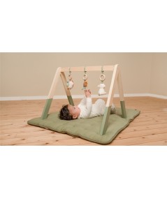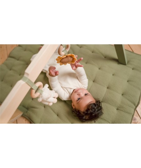 Gimnasio de madera para bebé con actividades, fabricado en madera resistente, e incluye tres juguetes de peluche con diferentes texturas y tocar y sentir.