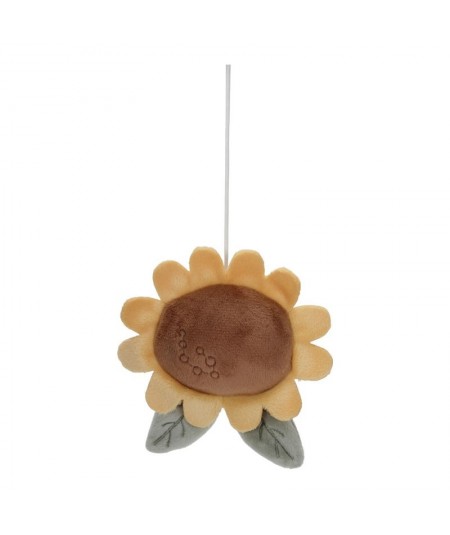 Precioso móvil musical para cuna o parque, fabricado en madera y 5 colgantes de peluche: El girasol, la granja, la vaca, la oveja y la gallina, con efecto relajante gracias a la dulce canción de cuna.