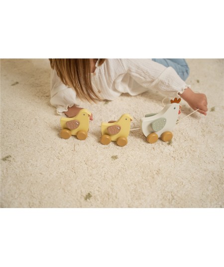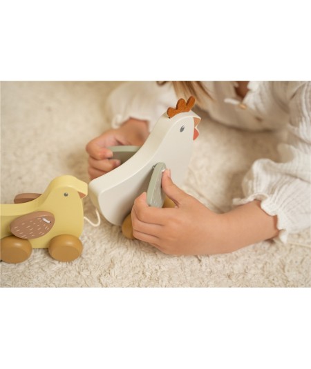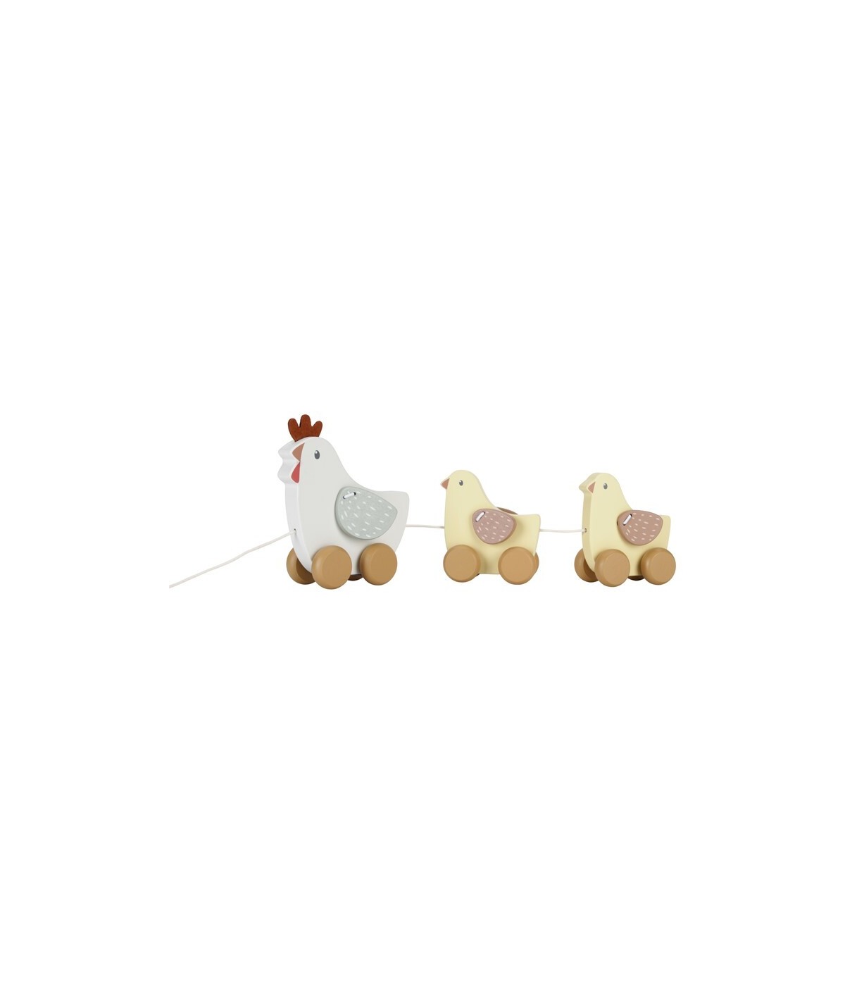 Arrastre de madera con diseño de gallina con sus pollitos, con una pequeña cuerda para que puedan arrastrarlo. De Little Dutch.