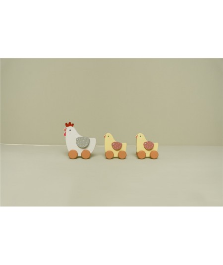 Arrastre de madera con diseño de gallina con sus pollitos, con una pequeña cuerda para que puedan arrastrarlo.