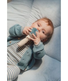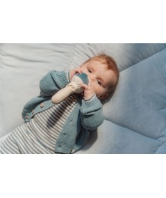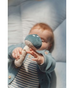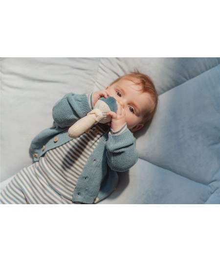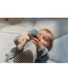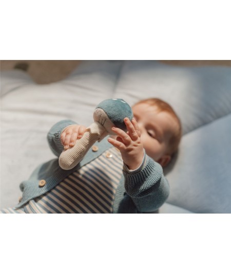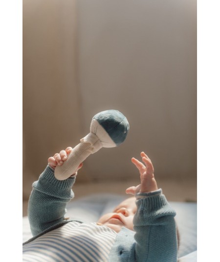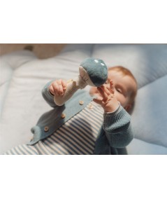 El alegre sonido promueve el desarrollo auditivo, así como la coordinación ojo-mano, estimulando la curiosidad del bebé.