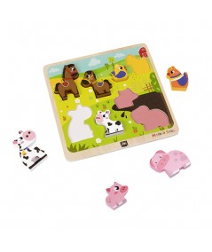 Encaje de madera de animales de granja, donde los niños y niñas deberán colocar cada figura en su lugar correspondiente. Con él también aprenderán los distintos animales así como las formas y colores.