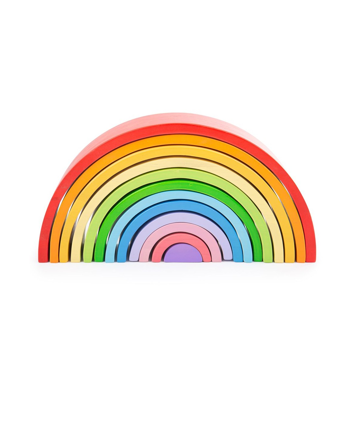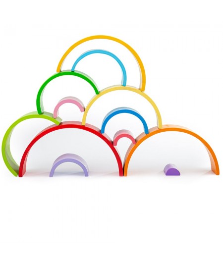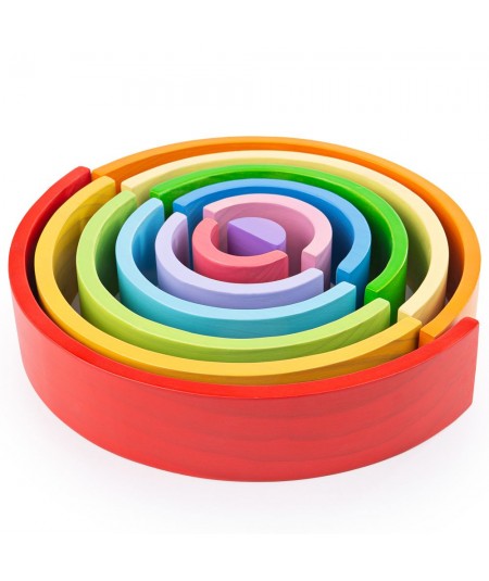 Set de 12 piezas de madera con diferentes tonalidades y tamaños en forma semicircular de arcoíris. De Bigjigs.