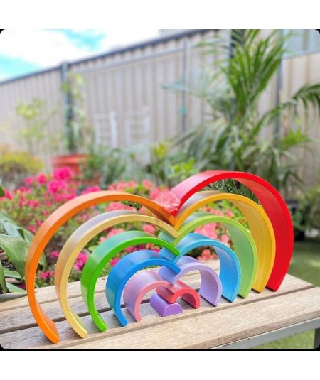 Set de 12 piezas de madera con diferentes tonalidades y tamaños en forma semicircular de arcoíris.