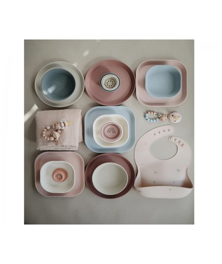 Vajilla para infantil de 5 piezas, compuesta por plato, bol, cuchara, tenedor y vaso. Serà una solución completa para las comidas de los más pequeños, diseñada para combinar estilo y funcionalidad. De Mushie.