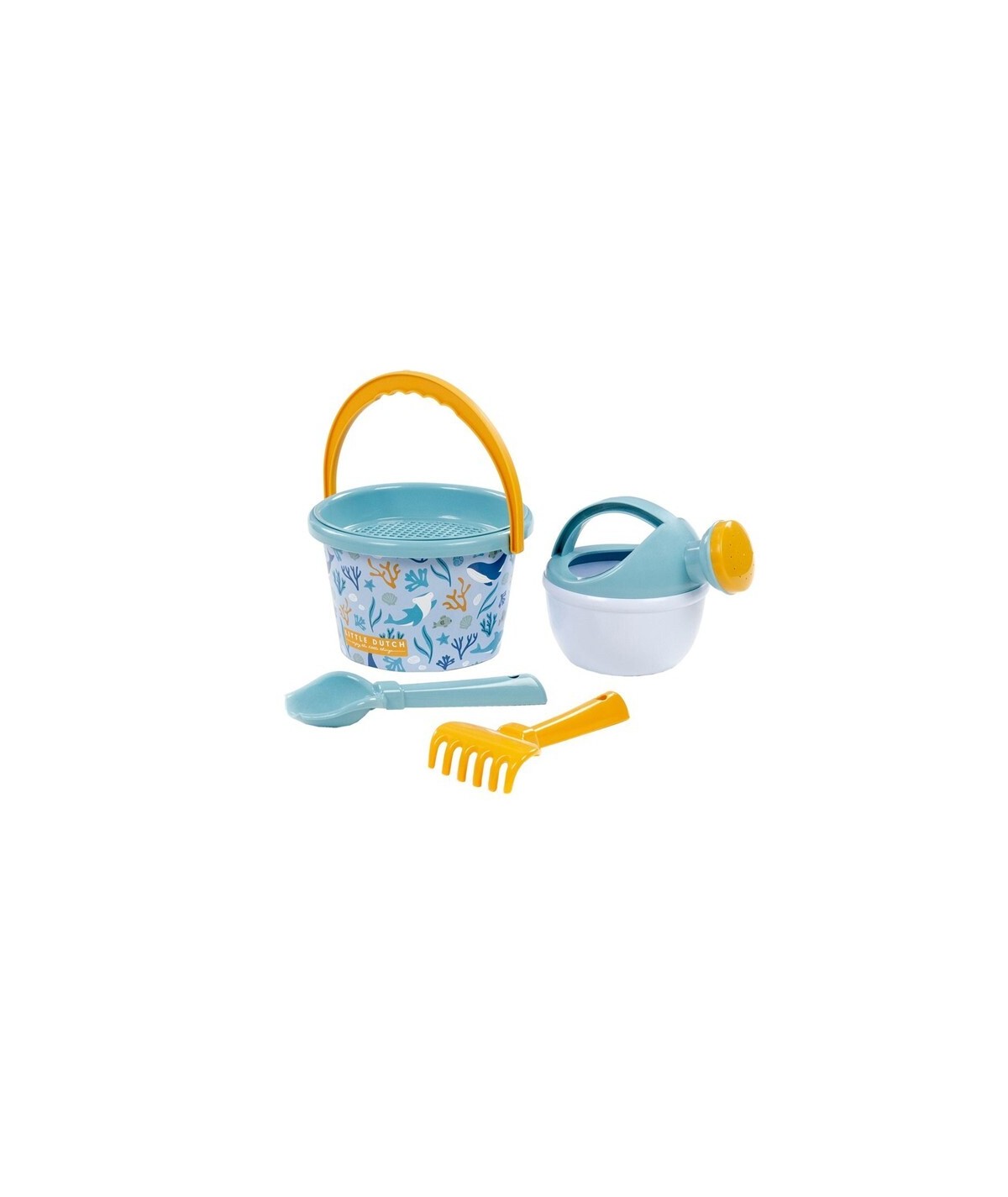 Bonito set de playa compuesto de 5 piezas: regadera, cubo, colador, pala y rastrillo, de la colección Ocean Dreams Azul. De Little Dutch.