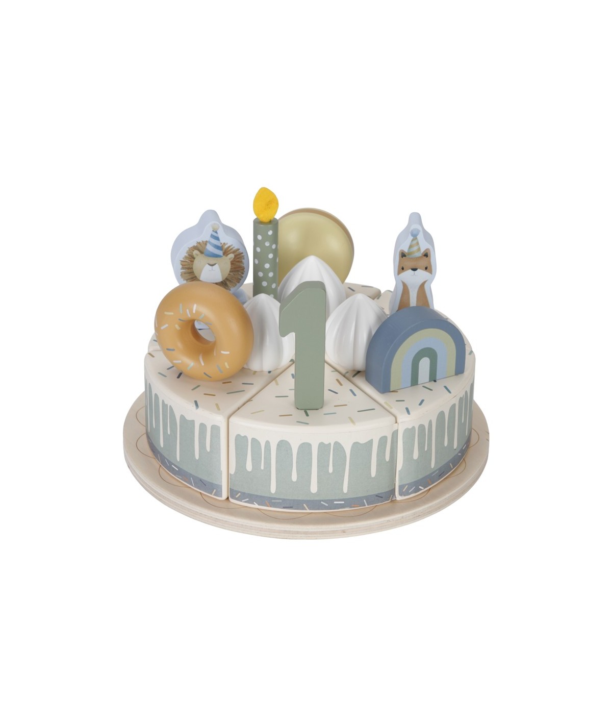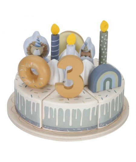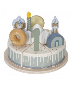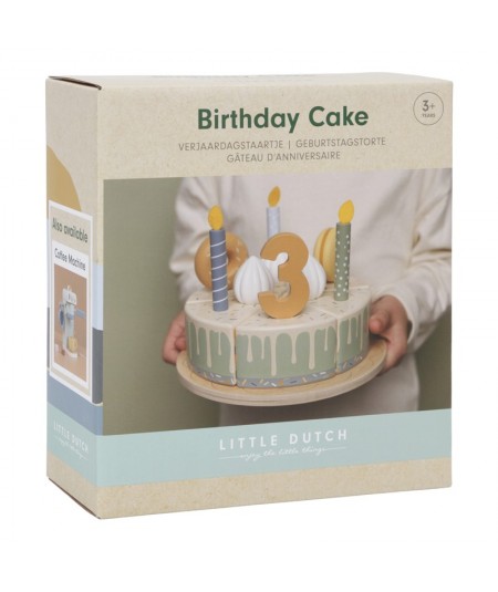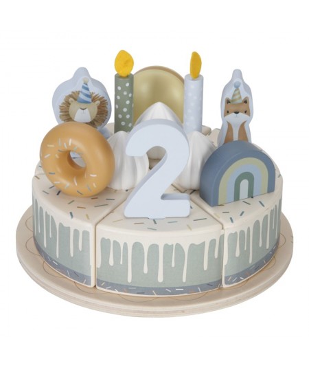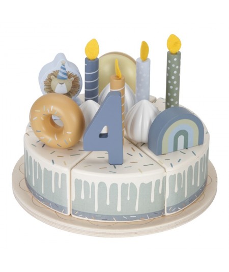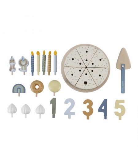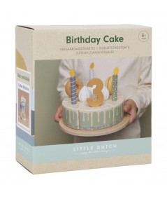 Pastel o tarta de cumpleaños de madera con accesorios y con separación de porciones mediante velcro. De Little Dutch.