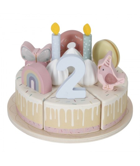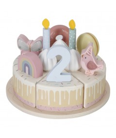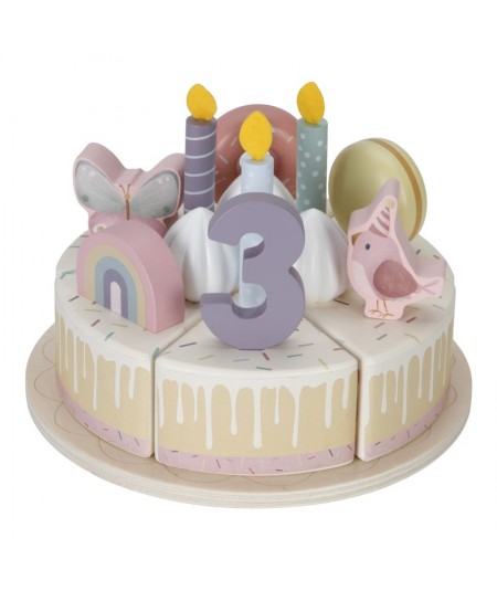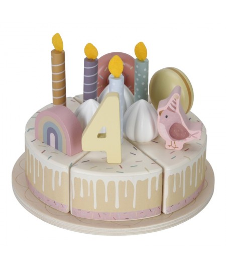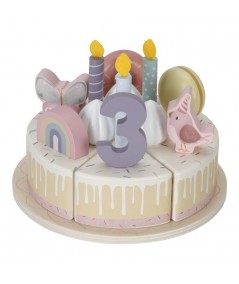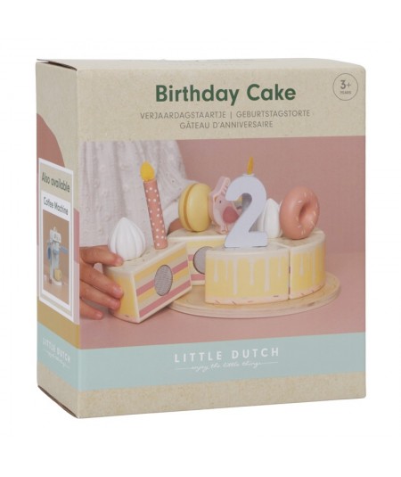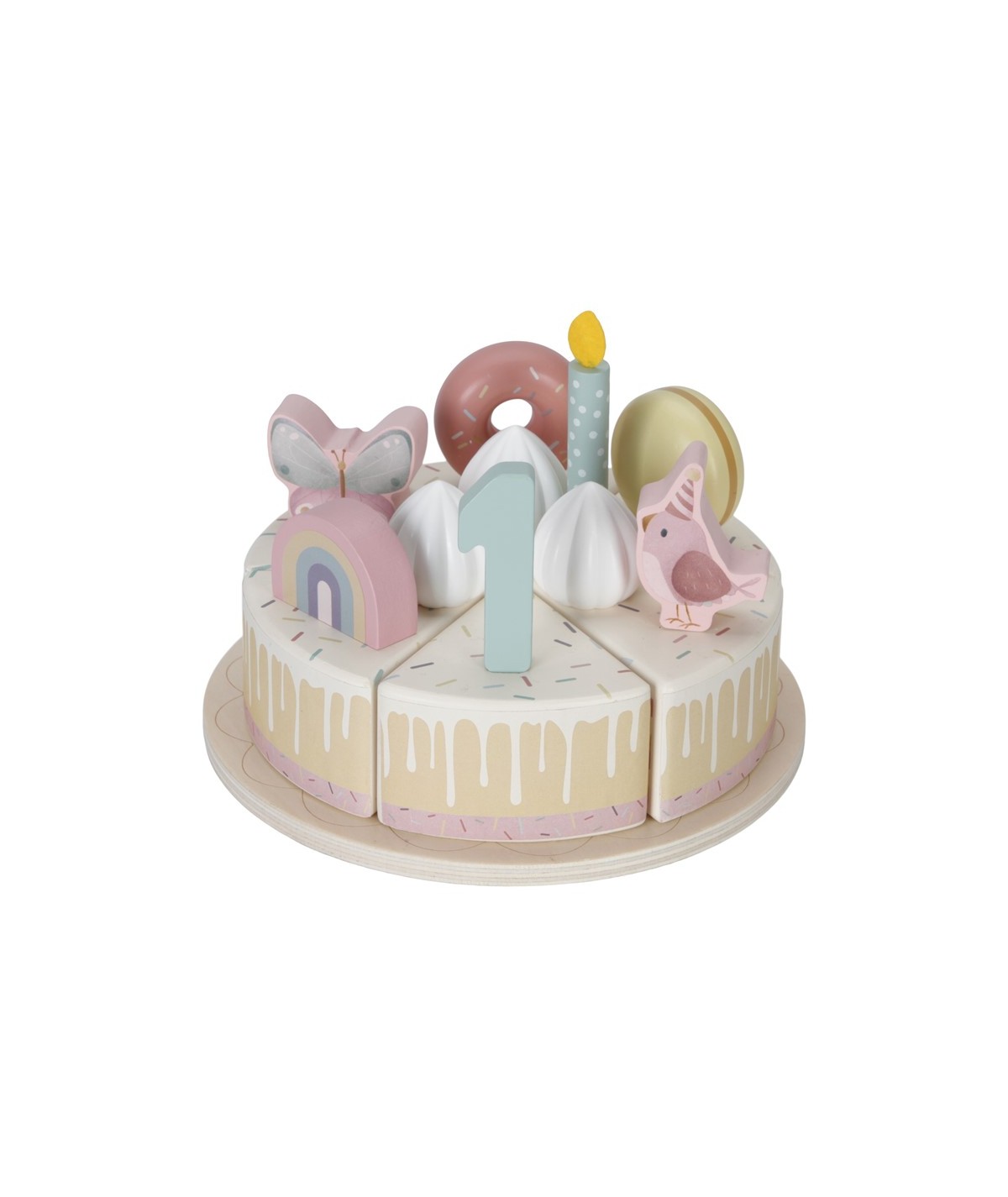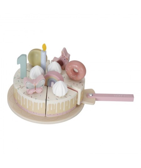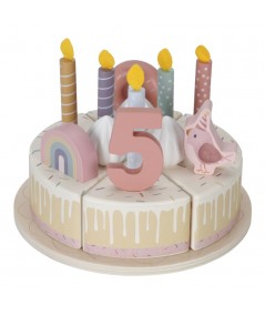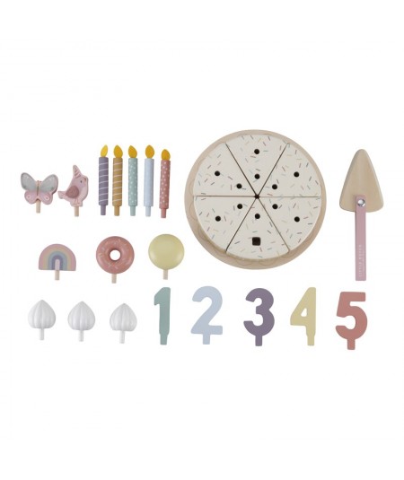 Pastel o tarta de cumpleaños de madera con accesorios y con separación de porciones mediante velcro. De Little Dutch.